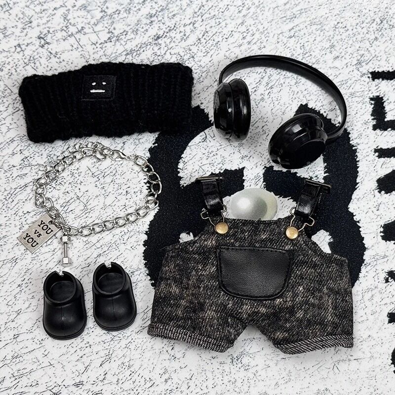 Stylish “YOU VS YOU” streetwear outfit for 17 cm Labubu dolls. Includes overalls, beanie, necklace, headphones, and shoes. (Doll not included.)